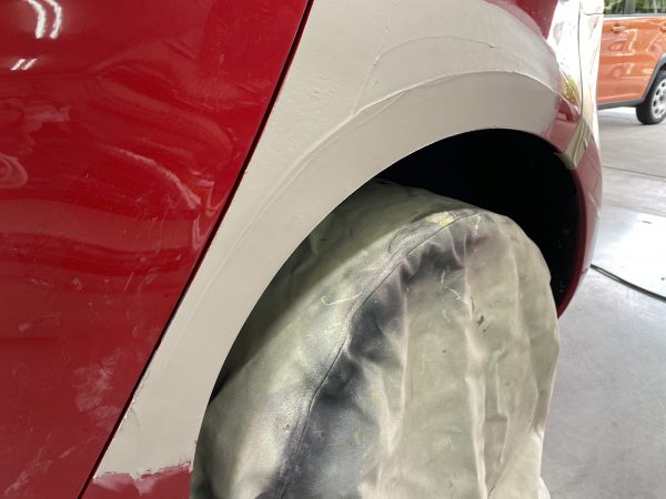 上の写真はパテですね🎶 あらかじめパネルの凹んだ部分を叩き出してから細かい凹凸を消すためにパテを